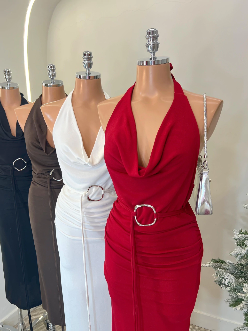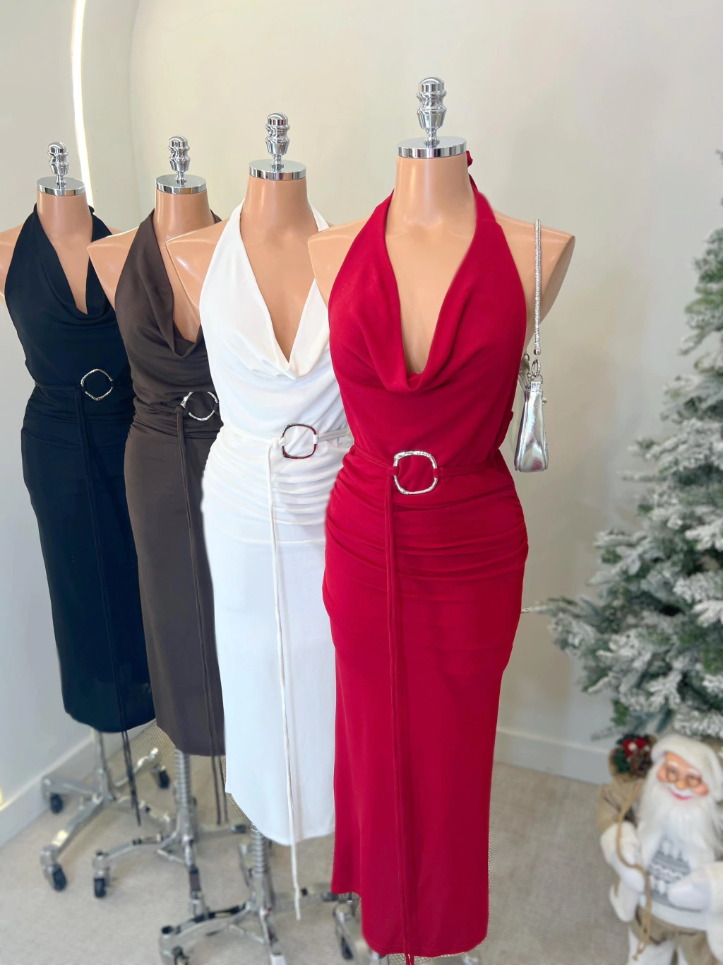 Vestido Longuete Drapeado Frente Única com Detalhe Prata